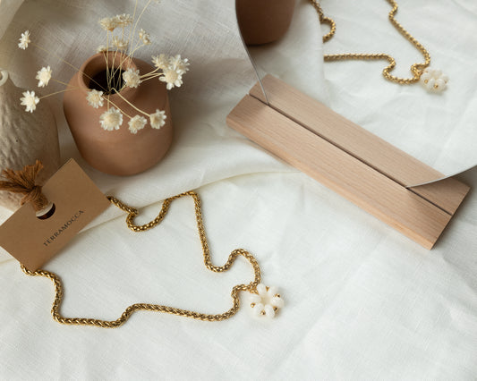 DÉTAILS DU PRODUIT Perles en verre roses, blanches et dorées Fermoirs et extensions en acier...