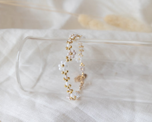 DÉTAILS DU PRODUIT Perles de Miyuki blanches, perles beige clair/grises, et perles Toho dorées Fermoirs...