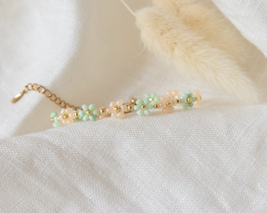 DÉTAILS DU PRODUIT Perles en verre couleur menthe et saumon, et perles Toho dorées Fermoirs...