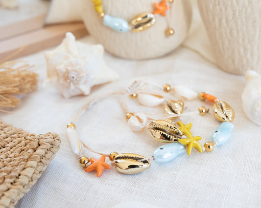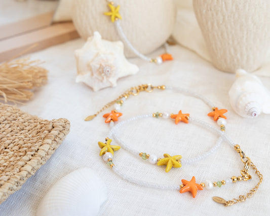 DÉTAILS DU PRODUIT - CHEVILLE Petites coquilles beiges et dorées Petites étoiles de pierre orange...