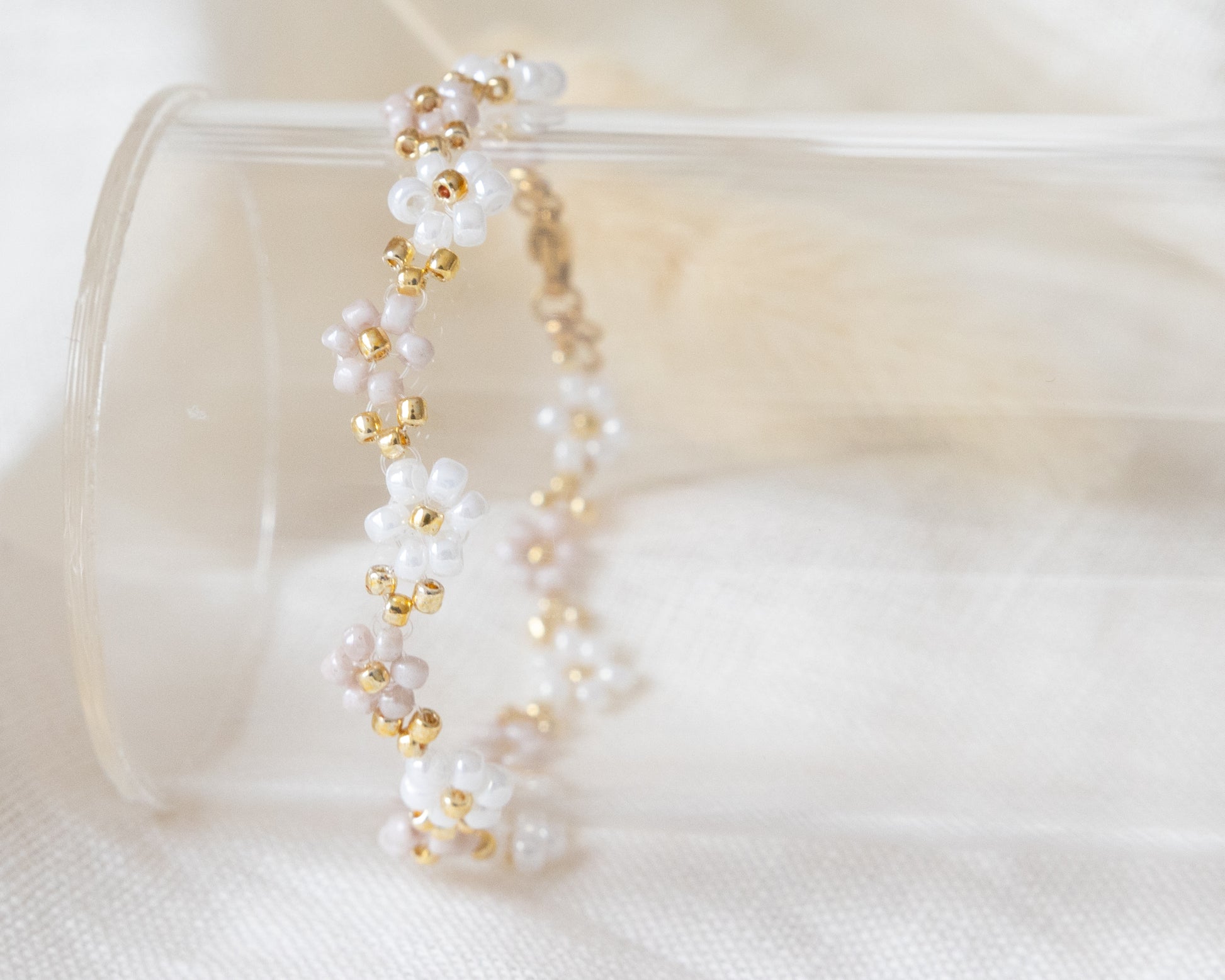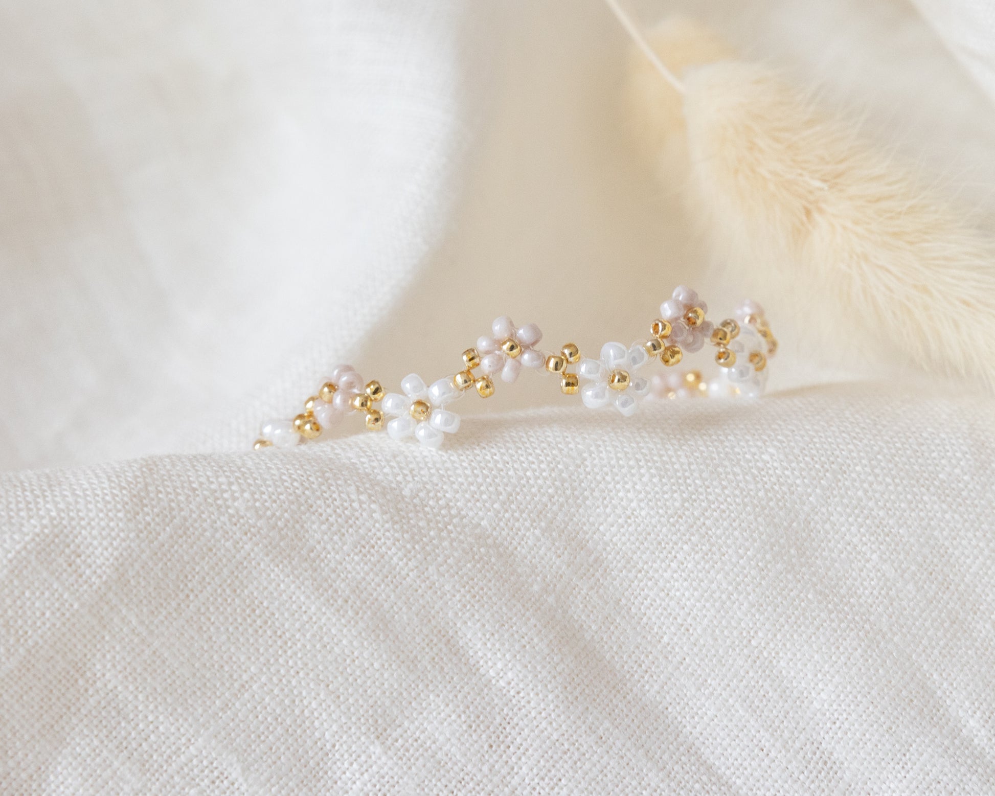 - White Miyuki seed beads, light beige/greyish glass beads and golden Toho beads